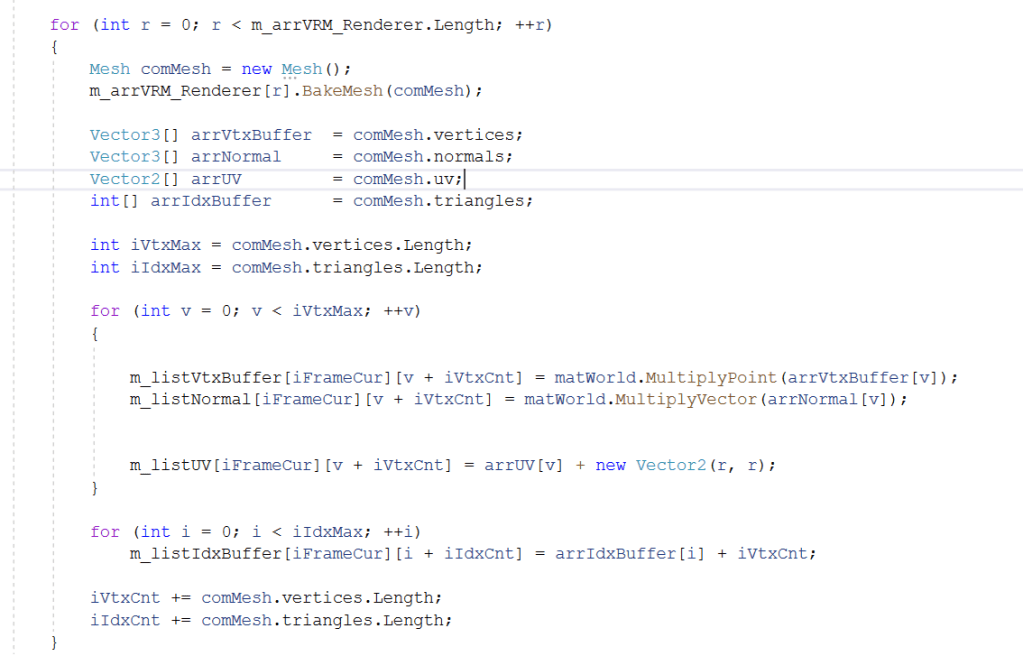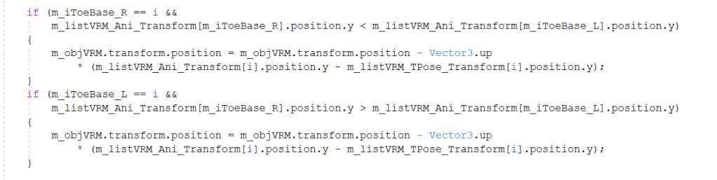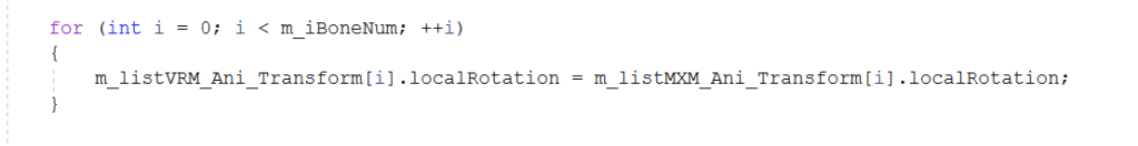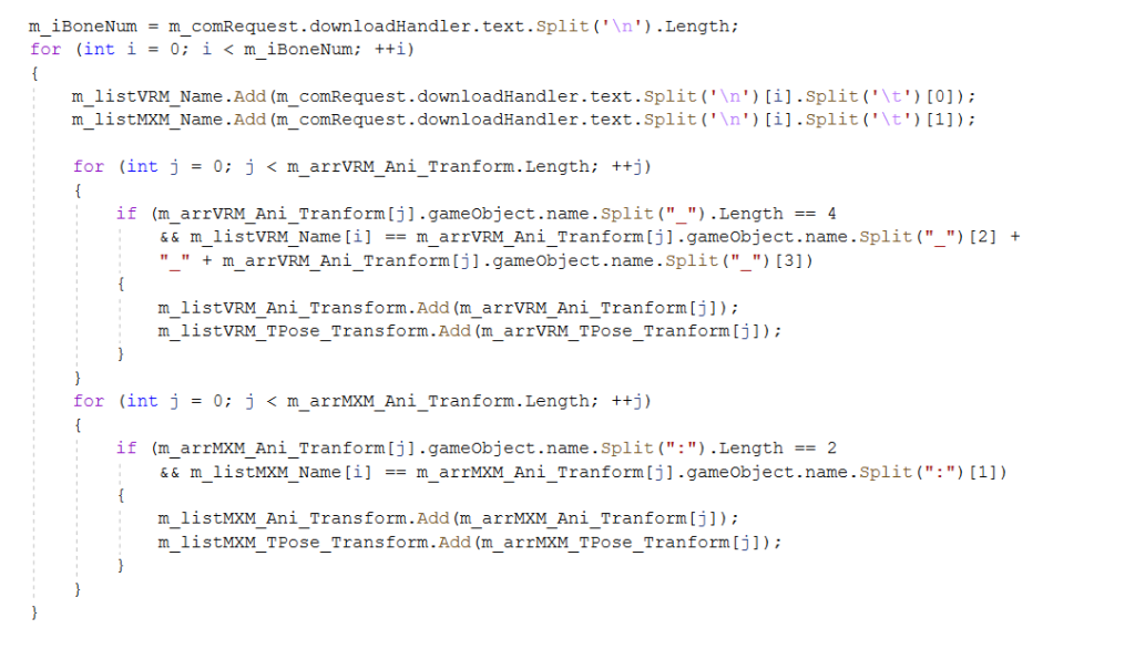 이를 해결하기 위해 “Mixamo”에서 애니메이션 정보를 추출하기 위해 모델링의 TPose의 정보를 유니티에 가져왔다. 그리고 TPose의 뼈대 정보 값과 애니메이션이 적용된 메쉬의 뼈대 정보 값의 격차만큼 VRM 모델링에 적용시켜 준다. 즉 VRM 모델링의 리깅 정보와 “Mixamo”모델링의 리깅 정보가 달라도 TPose 상태에서 적용할 수 있는 순수한 애니메이션 “Mixamo”로부터 추출하여, 애초부터 TPose인 VRM 모델링에 적용시키는 것이다.