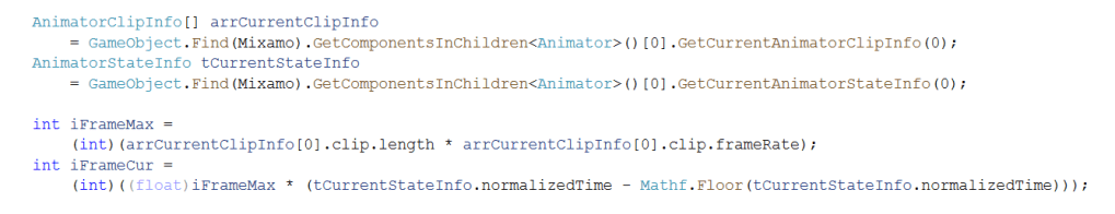 드디어 VRM 모델링의 애니메이션들을 베이킹할 차례이다. 베이킹을 하기 위해 믹사모 모델링의 “Animator Component”에서 Frame 관련 정보들을 추출한다. 따로 유니티에서 제공해주지 않으니 직접 계산해야 한다.