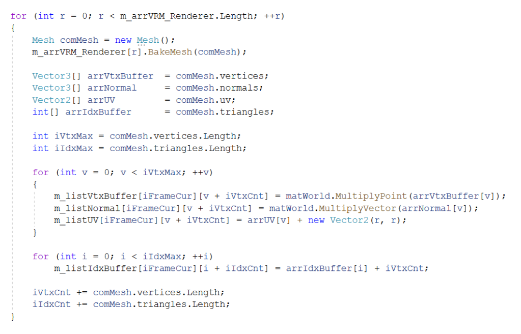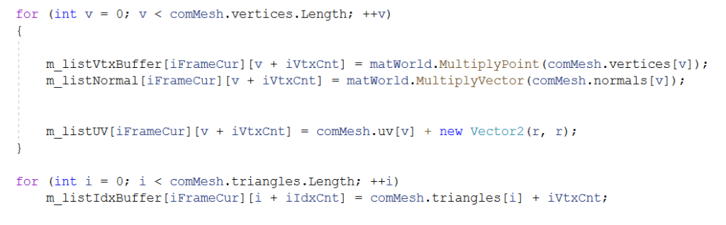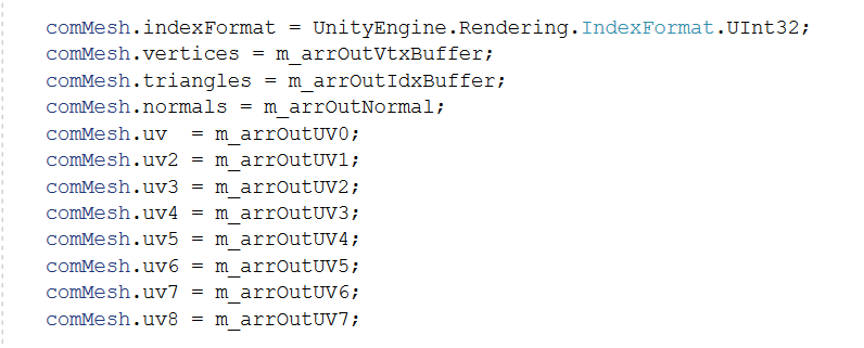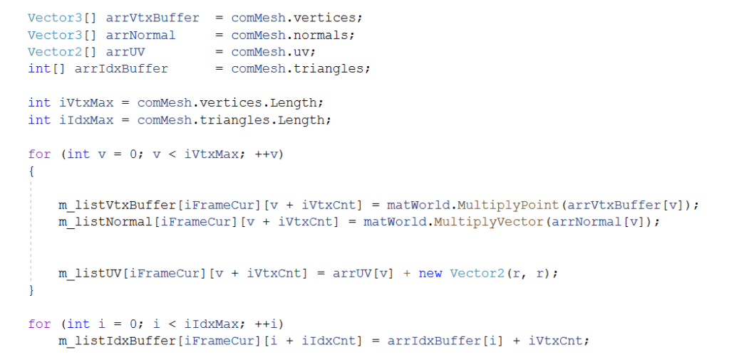 그리고 Unity환경에서 코드로 모델링을 작성할 경우 크게 실수하는 부분이 있다. Mesh 내부 배열에 지속적으로 접근하면 안된다. 이렇게 코드를 짜면 Unity 실행 시 엄청 버벅이거나 최악의 경우 멈춰버린다.