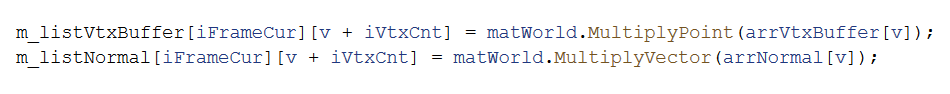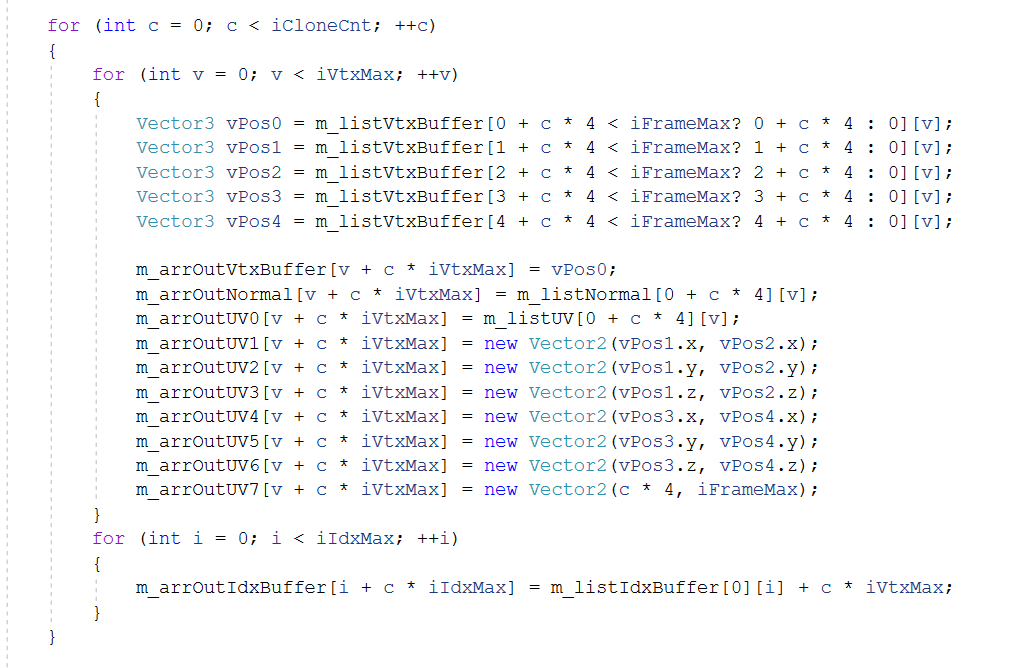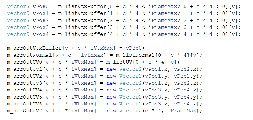 아까 녹화한 데이터들을 점정들의 시멘틱에 저장해 애니메이션을 재생할 것이다. 1개의 정점에서 총 4개의 추가 애니메이션 정보를 저장하는 것이 가능하다. 또한 마지막 시멘틱에 프레임 재생에 관한 정보를 저장한다. 여기서 발생하는 단점은 1개의 정점이 4 Frame의 애니메이션 밖에 저장할 수 없다는 것이다.