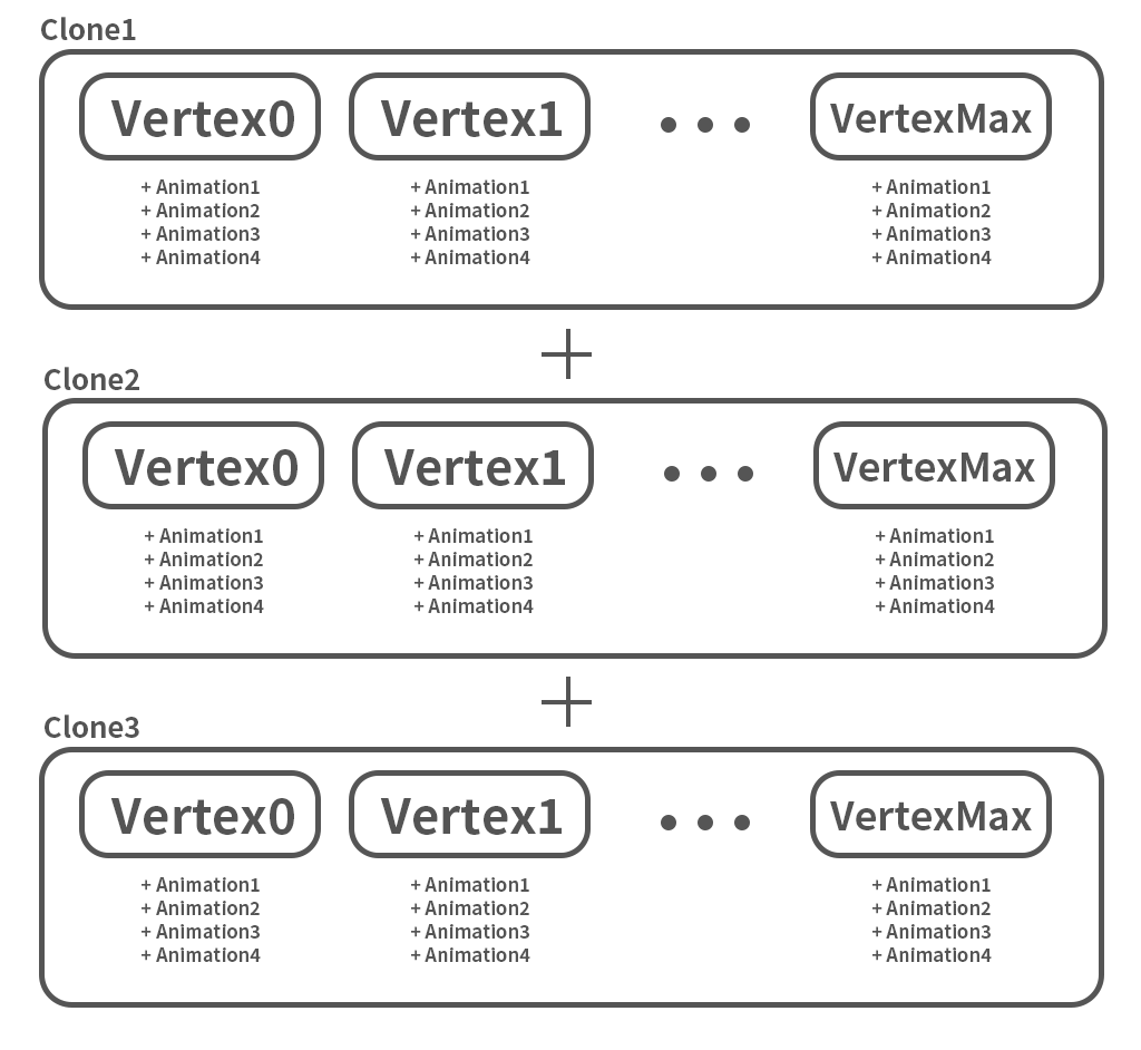 그렇기 때문에 VFX 업계에서는 GPU에서 애니메이션 정보를 처리하는 버텍스 애니메이션 텍스처 기술(VAT)을 이용하게 된다. 하지만 버텍스 수를 표현하기에 VAT는 제약이 크기 때문에 보통 10000개 이상의 폴리곤을 지닌 캐릭터를 구현하지 못한다. 왜냐하면 게임 업계에서는 보통 2048 * 2048 이상의 텍스처를 사용하지 않기 때문이다. 만약 사용한다 하더라도 메모리 소모가 심해서 기존의 방식대로 CPU에서 연산하는 것이 나을 수도 있다.