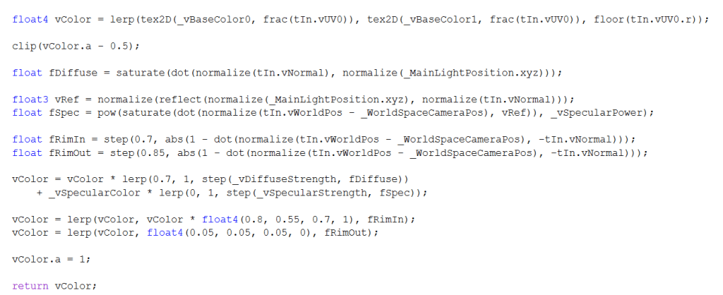 현재 HLSL로 작성하고 있기 때문에 기본적인 툰 쉐이더를 간단히 HLSL코드로 작성해두었다.
