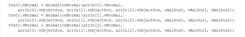 행렬을 구현한 뒤 수식을 바탕으로 노말의 애니메이션을 처리해준다. 삼각형의 모든 정점 정보를 알 수 있는 것은 지오메트리 쉐이더만의 장점이기 때문에 VAT 방식으로는 Unity에서 구현하기 힘든 노말처리도 해결가능하다. 위 영상과 같이 애니메이션에 따라 노말도 자연스럽게 구현되었다.