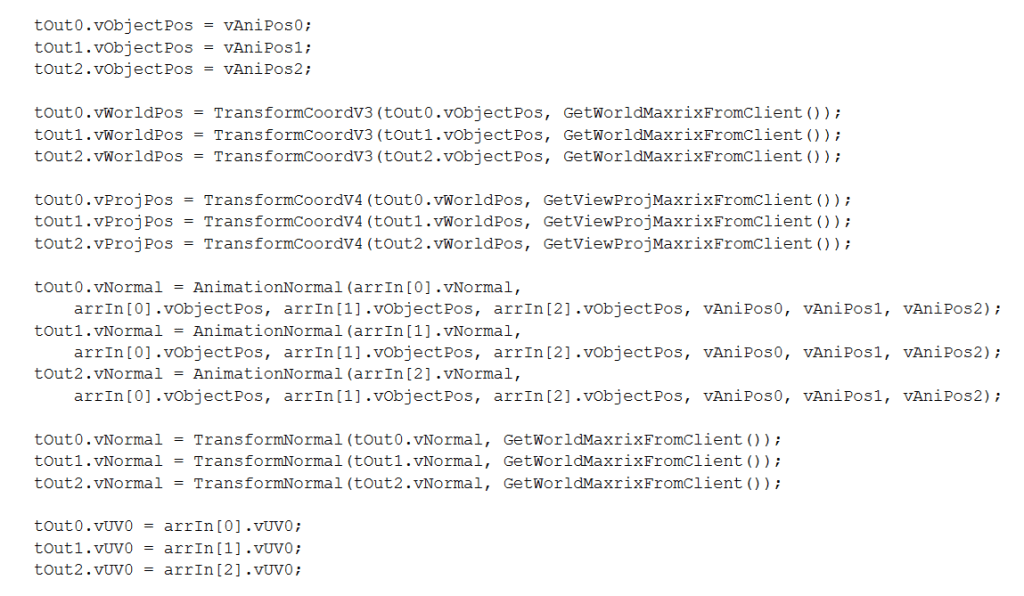 이렇게 녹화된 데이터들을 바탕으로 지오메트리 쉐이더에서 애니메이션을 구현할 것이다. 이러한 지오메트리 쉐이더 스키닝 방식을 설명하기에 앞서 일단 이 스키닝 방식을 고안한 배경부터 설득해보고자 한다.