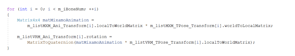 - 최종 VRM 애니메이션 = 믹사모 순수 애니메이션 x VRM TPose 행렬.